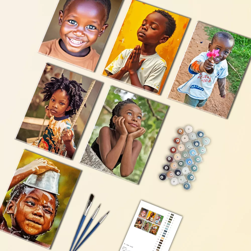 African Boy Mini Paint By Numbers is a cheerful, delightful mini collection showcasing radiant smiles, playful interactions, serene prayer images, and sunny outdoor atmospheres in deep skin hues and vivid backdropsEvery mini canvas is labeled for simple color coordination, and the set comes with mini canvases, paint containers, and brushes for immediate, enjoyable outcomes.