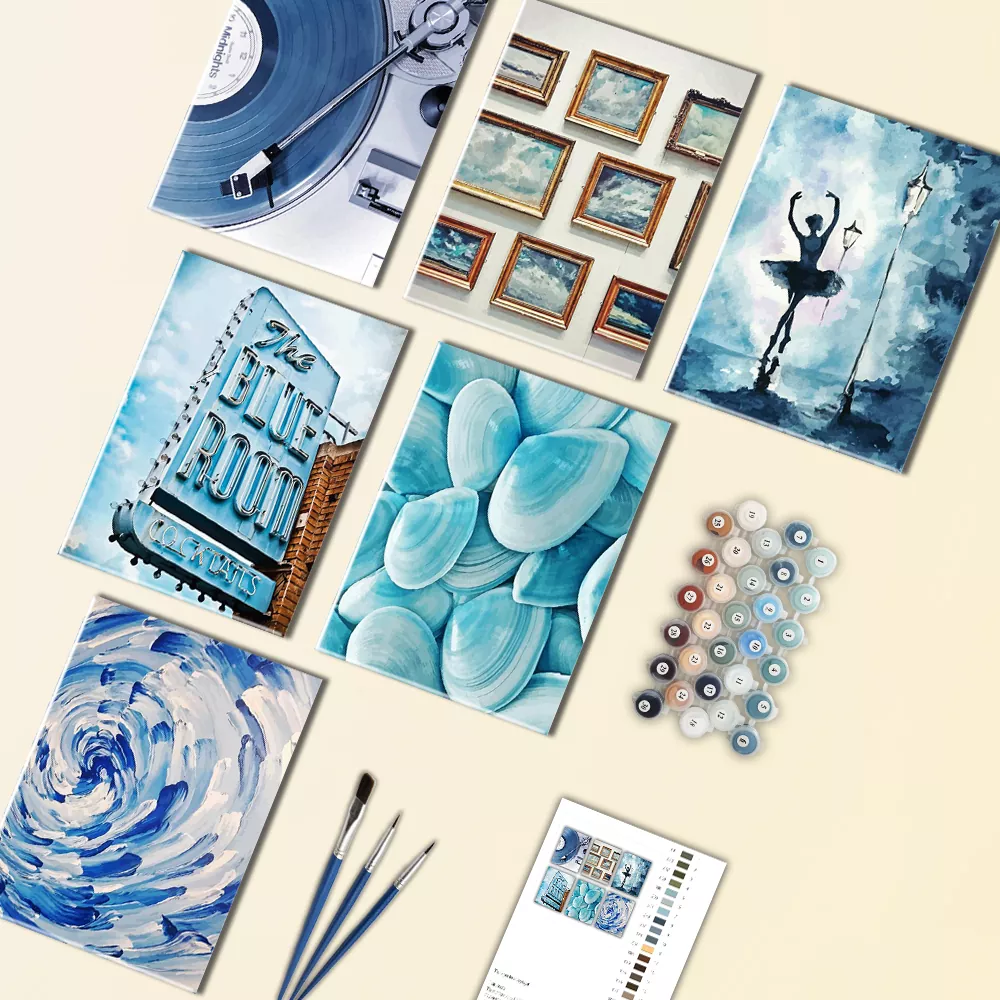 Blue Aesthetics Mini Paint By Numbers is a stylish, cool-toned mini series featuring contemporary blue elements, vinyl scenes, gallery displays, enigmatic silhouettes, neon lights, gentle abstract forms, and flowing brush textures. Every mini canvas is labeled for straightforward paint coordination, and the set comes with mini canvases, paint pots, and brushes to ensure fast, gratifying results.