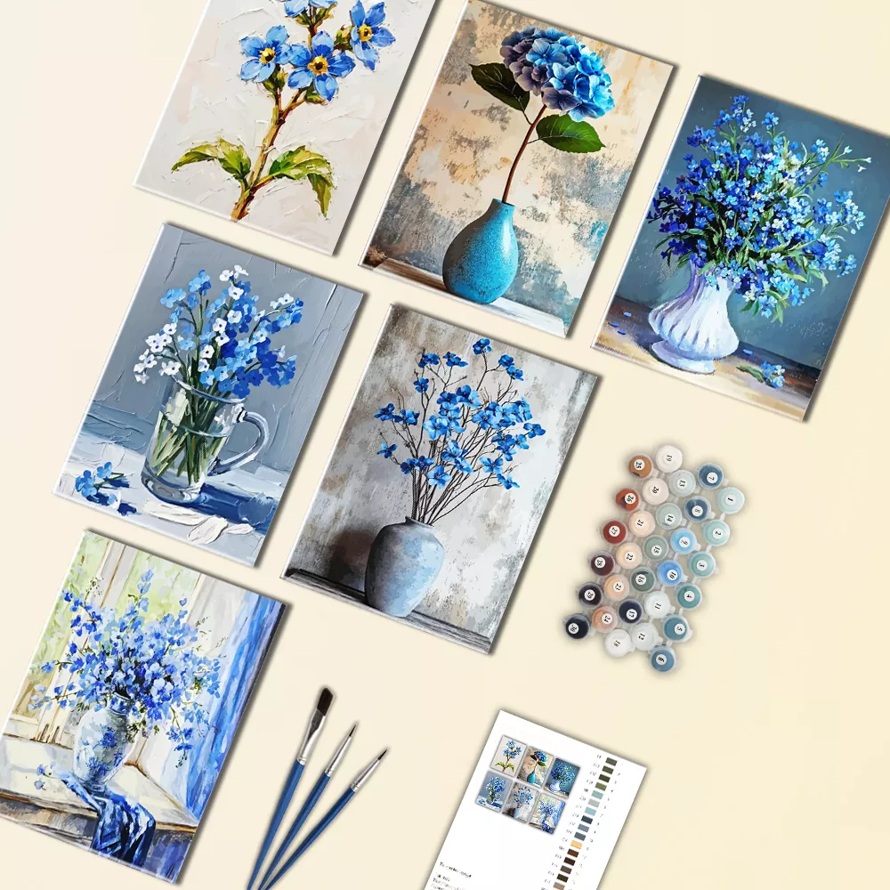 Blue Flowers Mini Paint By Numbers is a serene mini collection of delicate blue blooms in containers, blending light petals, cool hues, and charming still-life eleganceEvery mini canvas is labeled for straightforward paint coordination, and the kit features mini canvases, paint containers, and brushes for rapid, gratifying outcomes.