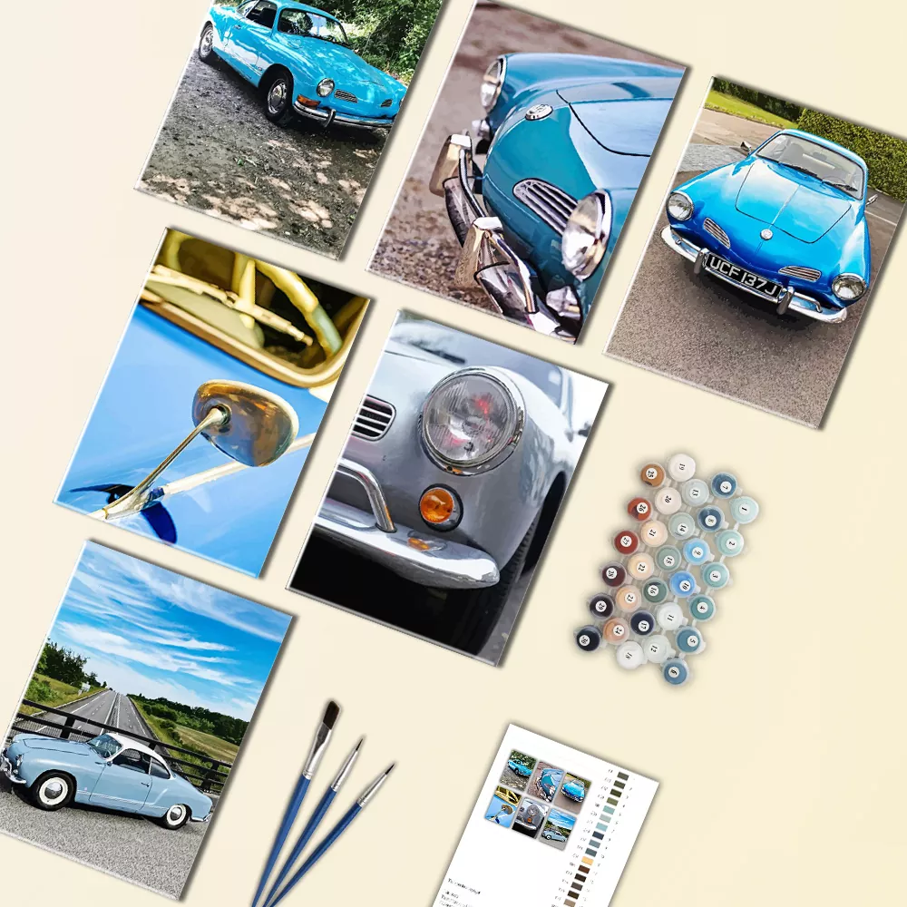 A quick, relaxing kit for classic car fans, featuring a blue Karmann Ghia in vintage mini scenes, full-car shots, glossy close-ups, and charming road views. Each mini canvas is numbered for easy paint matching, and Blue Karmann Ghia Mini Paint By Numbers comes with mini canvases, paint pots, and brushes for fast, satisfying results.