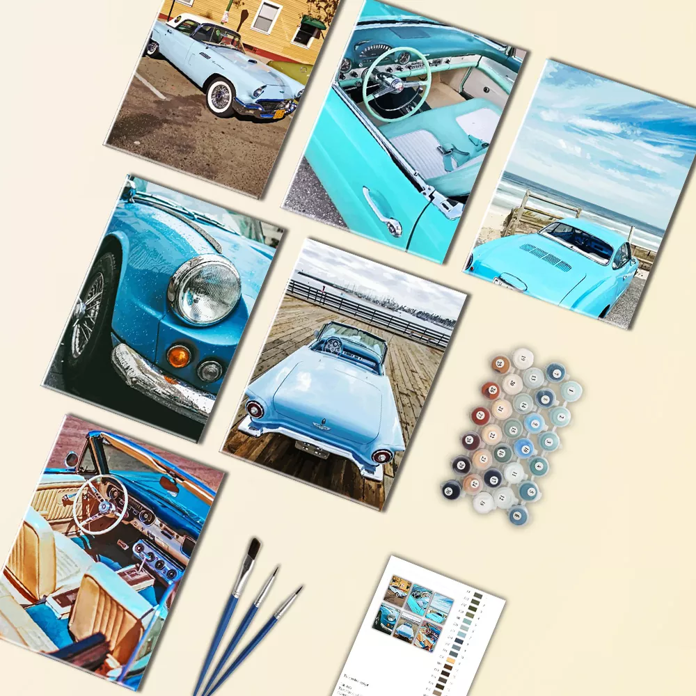 A quick, relaxing kit for classic car fans, featuring a blue Thunderbird in dreamy mini scenes, beach views, shiny close-ups, and vintage interior details. Each mini canvas is numbered for easy paint matching, and Blue Thunderbird Mini Paint By Numbers comes with mini canvases, paint pots, and brushes for fast, satisfying results.
