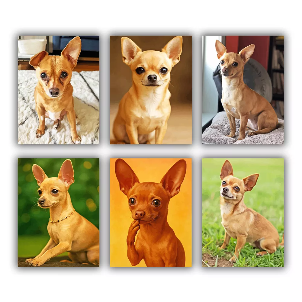 A quick, relaxing kit for dog lovers, featuring brown Chiweenie mini portraits with sweet expressions, cozy indoor shots, and bright outdoor backgrounds. Each mini canvas is numbered for easy paint matching, and Brown Chiweenie Mini Paint By Numbers includes mini canvases, paint pots, and brushes for fast, satisfying results.
