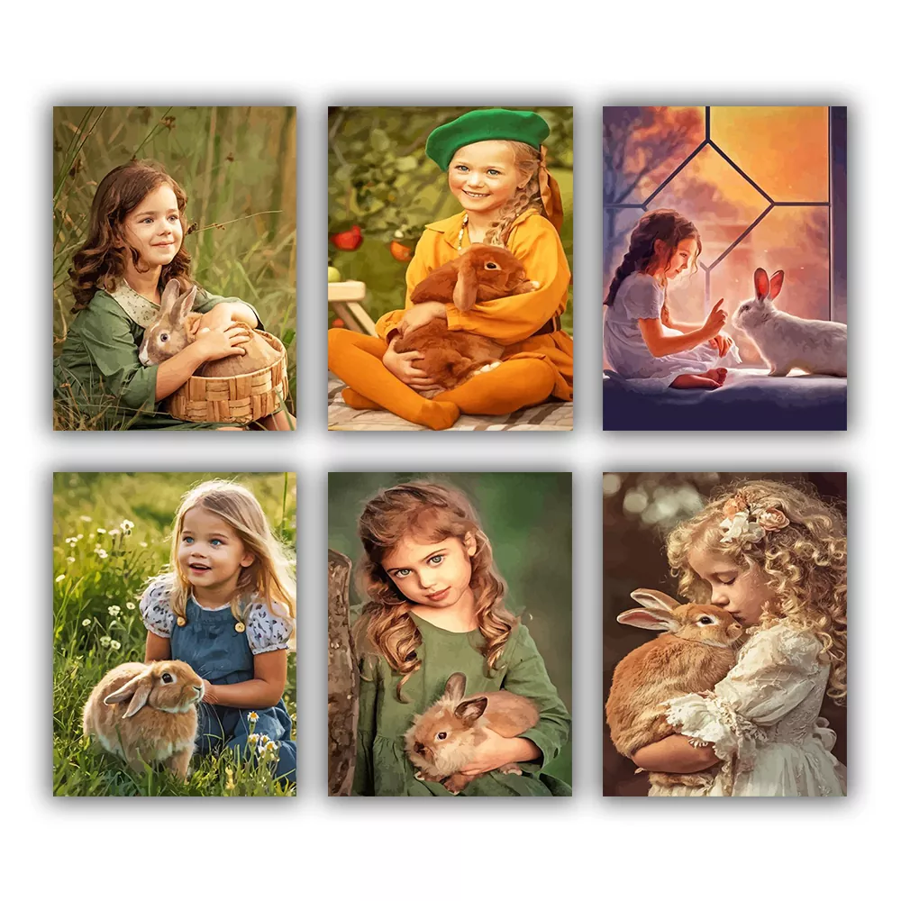 Girl with Rabbit Mini Paint by Numbers showcases a soothing assembly rich with tender instances, young girls hugging bunnies, enchanting storybook light, and tranquil meadow sceneryEach mini canvas is marked for easy paint matching, and the set includes mini canvases, paint pots, and brushes for fast, relaxing results