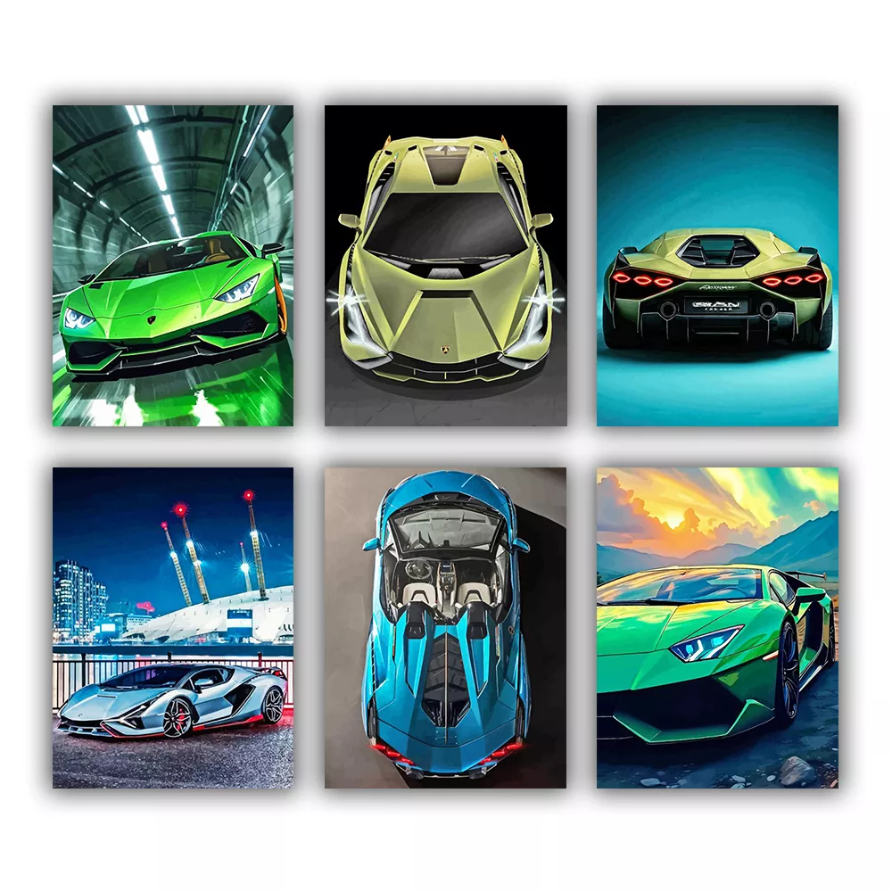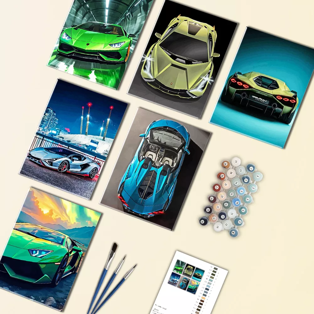 A quick, relaxing kit for supercar fans, featuring Lamborghini Sian mini scenes in bold colors, sunset drives, open-road shots, and sleek close-ups, plus a cockpit detail canvas. Each mini canvas is numbered for easy paint matching, and Lamborghini Sian Mini Paint By Numbers includes mini canvases, paint pots, and brushes for fast, satisfying results.