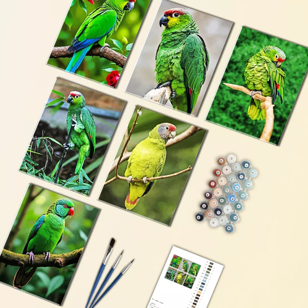 Lilacine Amazon Mini Paint By Numbers is a colorful small set showcasing vibrant green parrots with red highlights, leafy jungle aesthetics, and sharp feather details. Every mini canvas is labeled for straightforward paint coordination, and the kit comes with mini canvases, paint containers, and brushes.