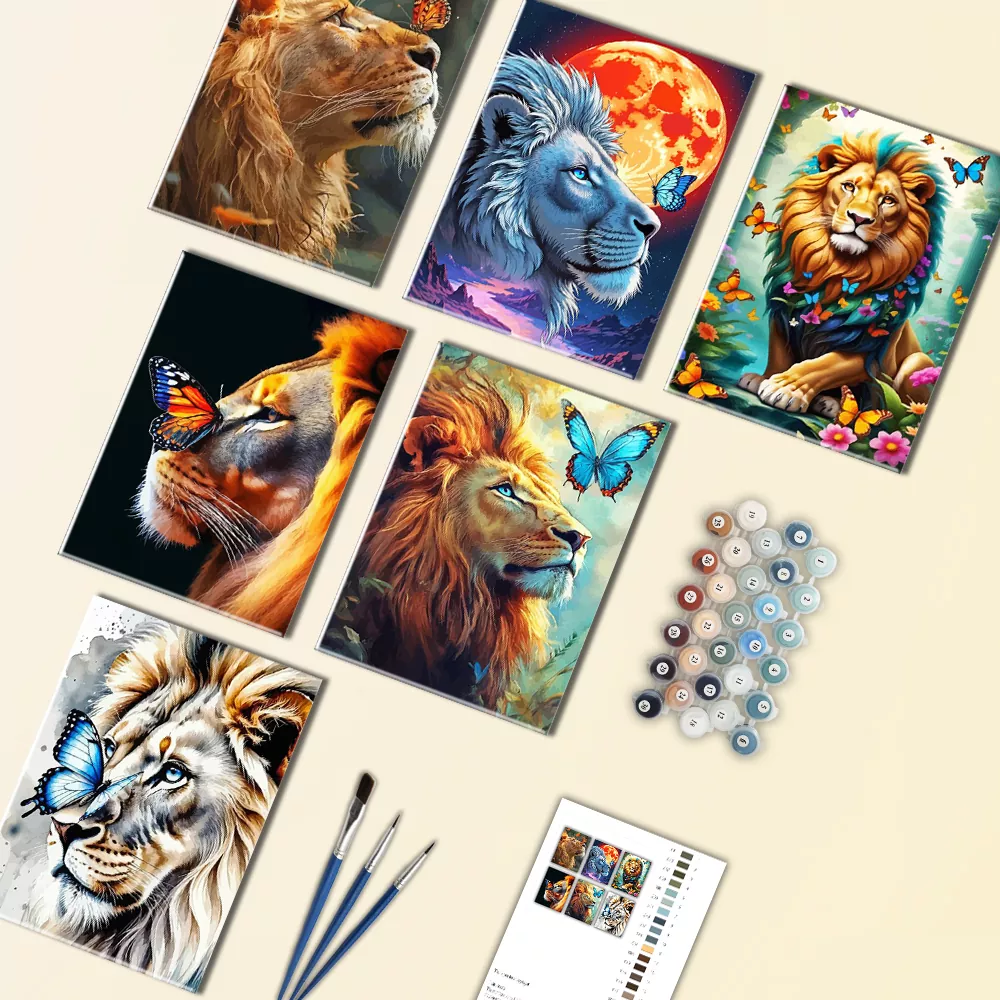 Lion and Butterfly Mini Paint by Numbers provides a quick, calming experience showcasing stunning, whimsical wildlife art, majestic lion visuals intertwined with vibrant butterflies, glowing moons, and colorful backgroundsEach mini canvas is tagged for easy paint organization, and the kit includes mini canvases, paint containers, and brushes for fast, satisfying results.