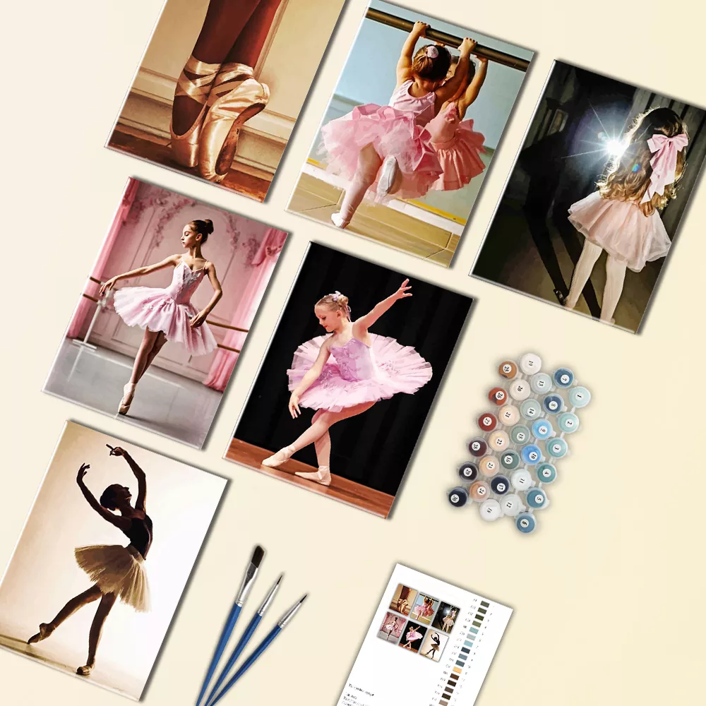 Little Ballerina Mini Paint by Numbers is an elegant, sophisticated collection inspired by ballet practices and performances, pointe shoes, soft pink tutus, and graceful poses in warm studio illuminationEach mini canvas is marked for easy paint matching, and the kit includes mini canvases, paint pots, and brushes for fast, fun results.