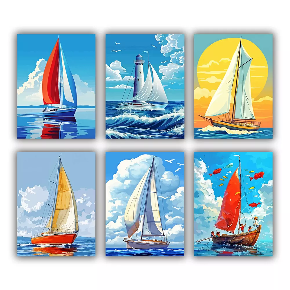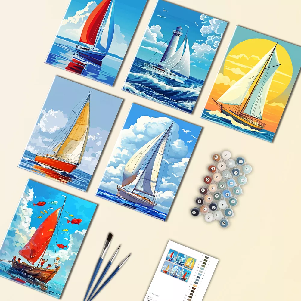 Little Cartoon Boat Mini Paint by Numbers features a fast, soothing collection of vibrant coastal images with colorful sailboats, gentle waves, fluffy clouds, and sunny skies presented in a whimsical cartoon mannerEvery mini canvas is labeled for simple paint coordination, and the kit features mini canvases, paint containers, and brushes for quick, gratifying outcomes.