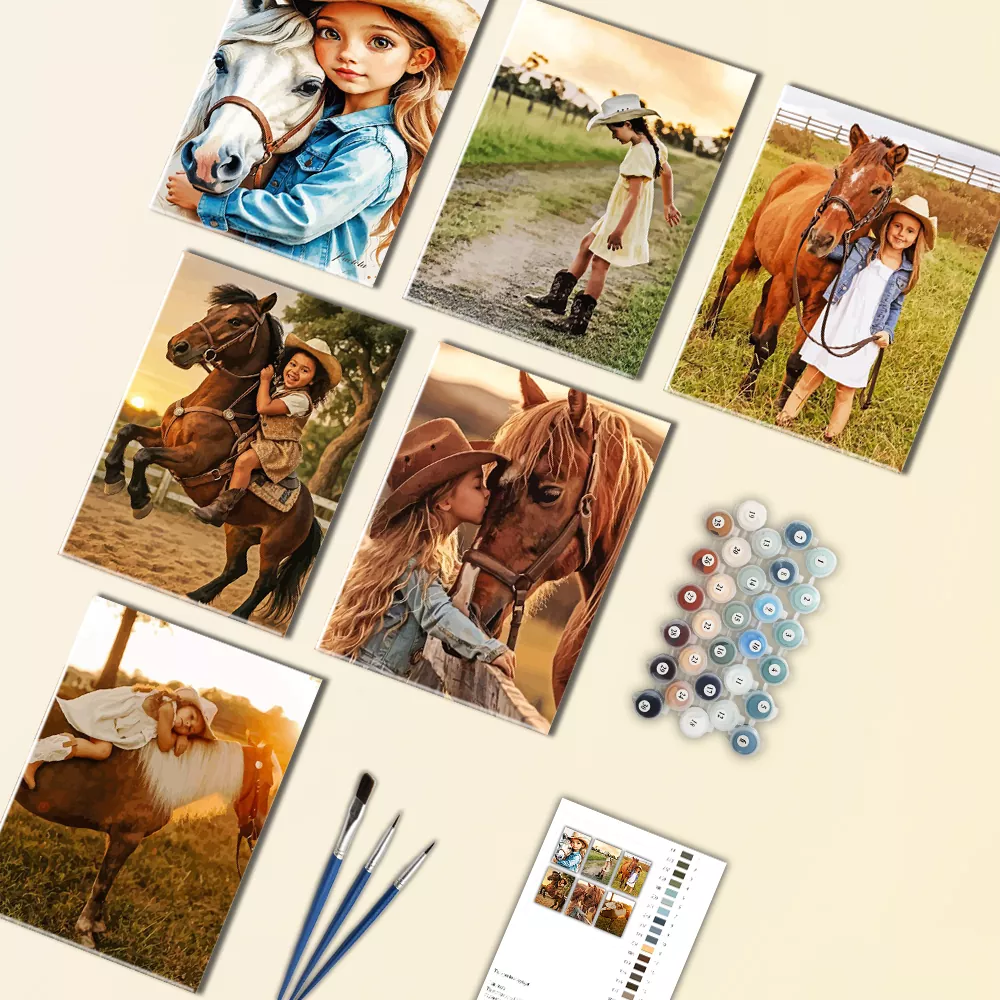Little Cowgirl Mini Paint by Numbers is a cozy, rustic themed collection featuring charming ranch illustrations, cowgirl hats, shimmering sunsets, and tender interactions with horses. Every mini canvas is labeled for simple paint coordination, and the set comes with mini canvases, paint pots, and brushes to deliver quick, enjoyable outcomes