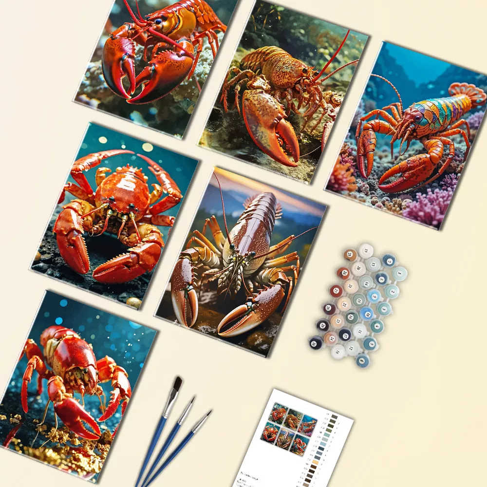 Lobster Mini Paint By Numbers features a striking mini collection of vibrant lobsters in vivid ocean reds and corals, showcasing glossy shells, dramatic claws, and deep-sea blue backdrops that give each panel a lively and enjoyable vibeEvery mini canvas is labeled for straightforward paint coordination, and the set comes with mini canvases, paint pots, and brushes for rapid, gratifying outcomes.