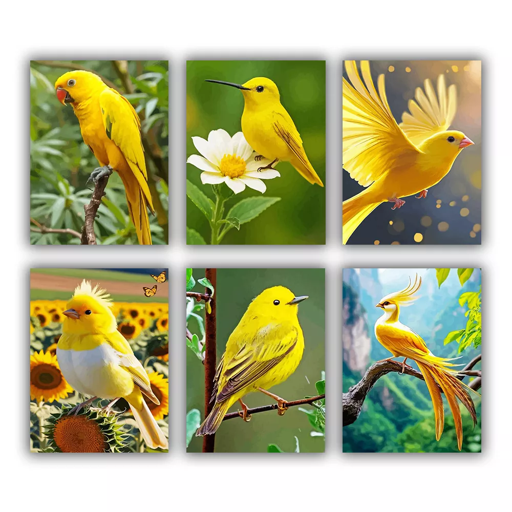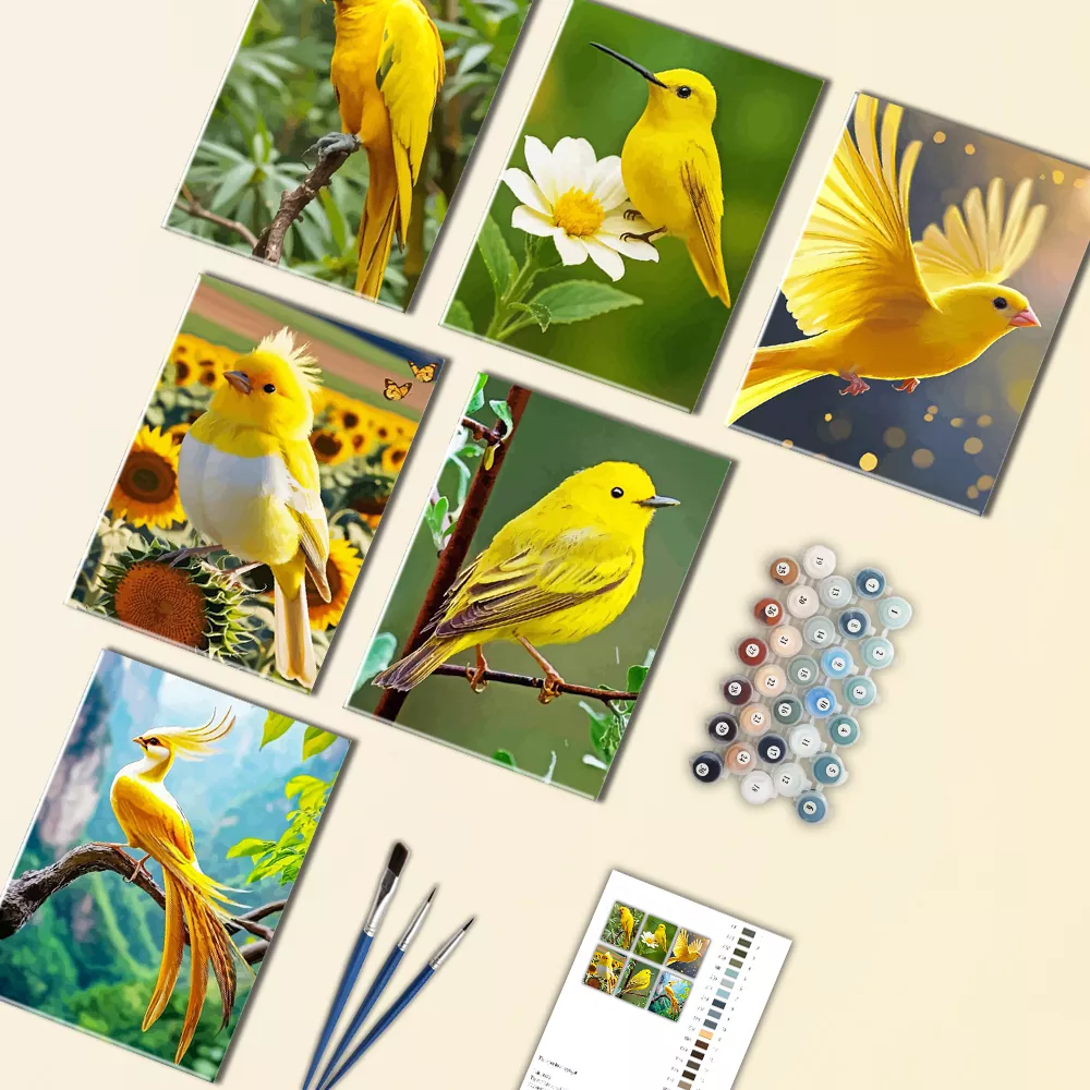 Yellow Bird Mini Paint by Numbers is a swift, cheerful collection featuring vibrant bird visuals, bright plumage, gentle green backdrops, blossoms, and light, easygoing posturesEvery mini canvas is labeled for convenient paint matching, and the set contains mini canvases, paint jars, and brushes for quick, pleasing outcomes.